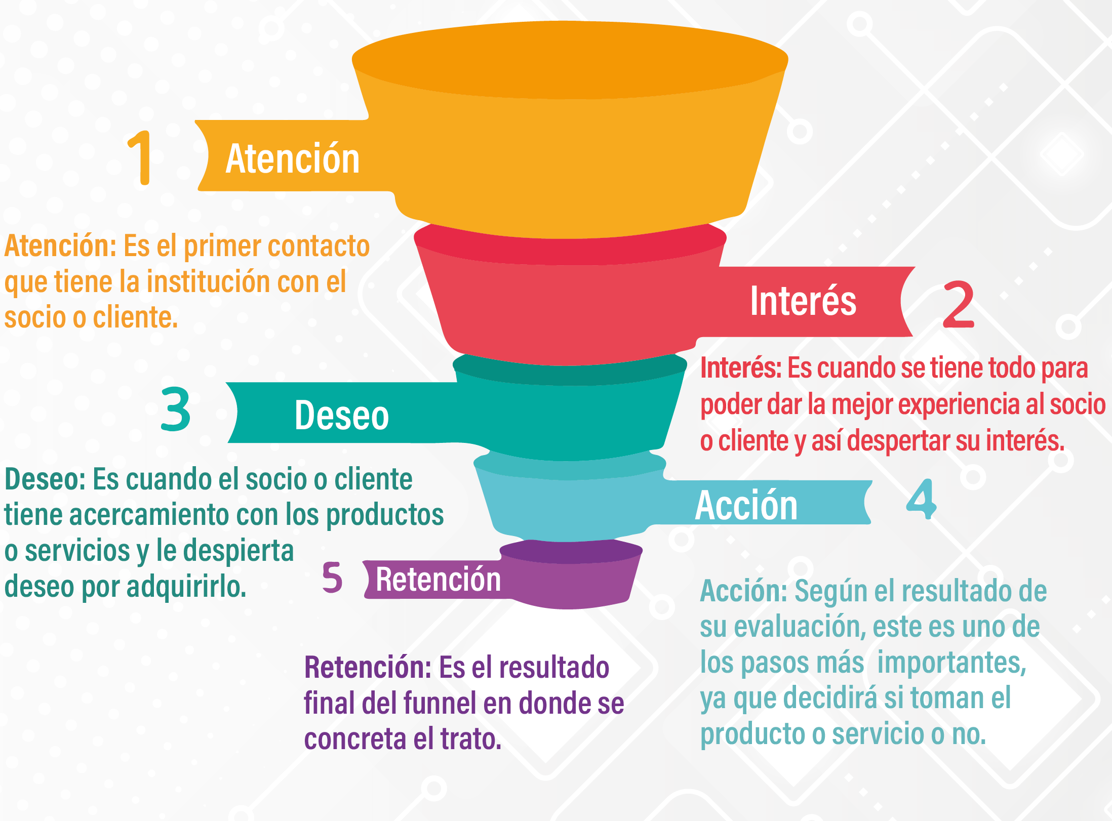 1.- Atención: Se anuncian los productos o servicios que ofrece la institución para llamar la atención de los socios/clientes.